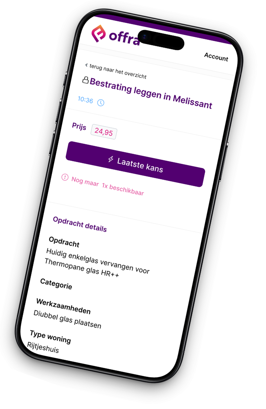 Offra.nl is een platform voor ambitieuze ondernemers. Als je toegelaten wordt tot ons netwerk krijg je de mogelijkheid om in contact te komen met serieuze klanten voor uiteenlopende aanvragen. Van complete woningrenovaties, aanbouw plaatsen, elektra vervangen tot aanleggen van tuinen.